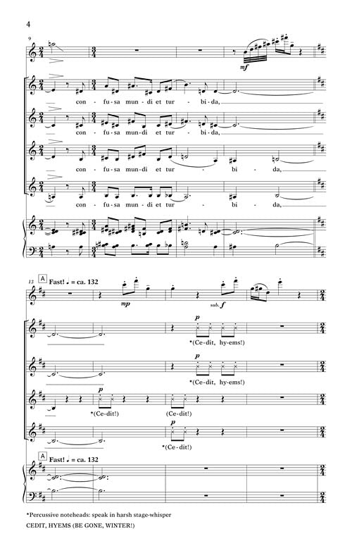 Now available in an SSAA edition! After an opening that evokes a confused and troubled world, this work bursts into a sweeping attempt to drive the world's coldness away in favor of love. Flute part included. Also available for SATB. Duration: ca. 3:00.
