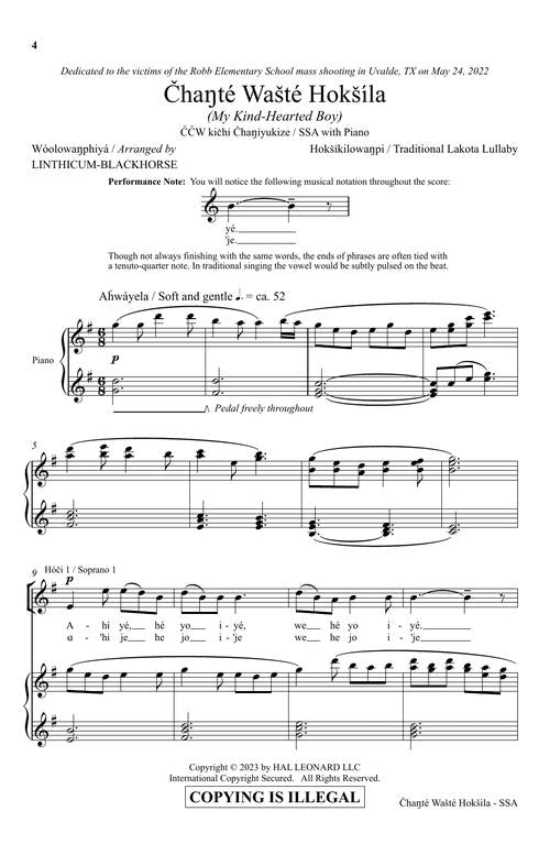 Here is a traditional Lakota lullaby that was often sung by mothers to their young boys. The Lakota language has become nearly extinct, but composer/arranger Linthicum-Blackhorse has made it his life's work to bring the language back to life. In this arrangement, the IPA pronunciation guide is included in the body of the music in order to make it accessible to all singers and choirs.