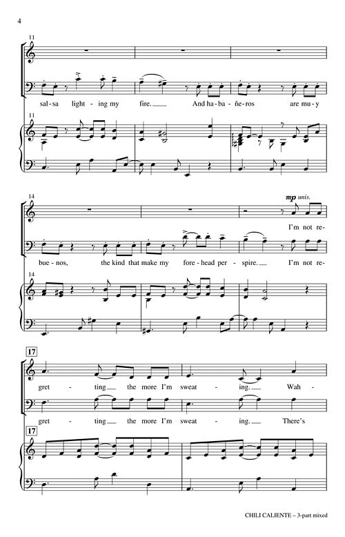 Some like it hot and some like it even hotter! This novelty piece blends the spicy sound of Rossini's The Barber of Seville with red-hot lyrics of peppers, salsa and heartburn! My eyes are a flame and I never get tired of the burn! Hot! Keep antacid near for performances! Available separately: 3-part mixed, optional baritone & percussion; 2-part, optional percussion; StudioTrax CD. Duration: ca. 2:50.