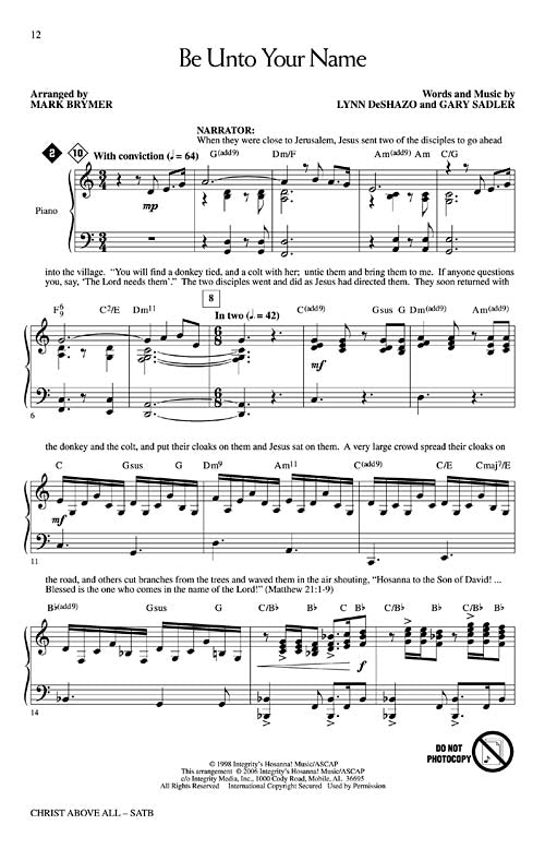 Using Above All as the focal point, this new Easter musical is filled with incredible songs of praise. The arrangements and orchestrations are spectacular. A biblical based narrative is included. It contains In Christ Alone, Be Unto Your Name, For the Bread Which You Have Broken, Above All, We Will Glorify, and Worthy is the Lamb as well as original material. Instrumental ePak contains score and parts for Flute 1, 2, Oboe, Bb Clarinet 1, 2, Bass Clarinet, F Horn 1, 2, 3, Bb Trumpet 1, 2, 3, Trombone 1, 2, Bass Trombone, Timpani, Percussion, Violin 1, 2, Viola, Cello, String Bass, Guitar, Bass and Drums. ChoirTrax CD also available. Performance Time (if perform in its entirety): Approx. 30 minutes