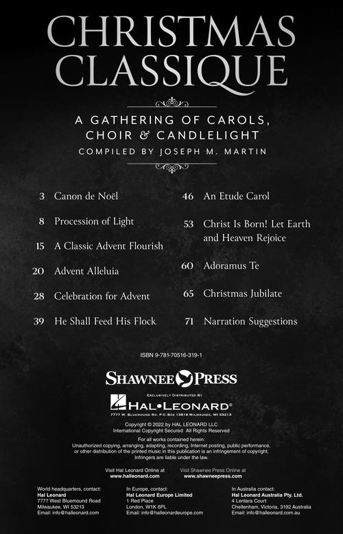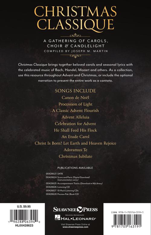 This choral compilation brings together beloved carols and new seasonal lyrics with celebrated music from Bach, Handel, Mozart and others. As a collection, you can use this resource throughout Advent and Christmas, or use the optional narration to present the entire work as a cantata. A full line of support products is available to enable your performance options. Score and Parts (instrumentation varies by song) available as a digital download. For the Accompaniment Tracks: Audio is accessed online using the unique code generated upon purchase and can be streamed or downloaded. The audio files include PLAYBACK+, a multi-functional audio player that allows you to slow down audio without changing pitch, set loop points, change keys, and pan left or right. HL00428625: Accompaniment Tracks Songs include: Canon de Noel; Procession of Light; A Classic Advent Flourish; Advent Alleluia; Celebration for Advent; He Shall Feed His Flock; An Etude Carol; Christ Is Born! Let Earth and Heaven Rejoice; Adoramus Te; Christmas Jubilate.