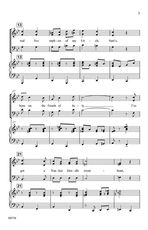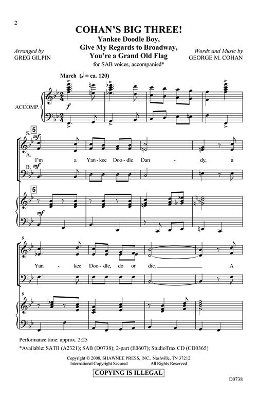 Three of George M. Cohan's finest songs have been arranged into a smart and fun medley by Greg Gilpin. Simple and easy-to-learn, this medley is an up-beat presentation to showcase patriotism and the works of a great American songwriter. This choral gives you a chance for good musical teaching during rehearsals and when performed, your audience will rise to their feet with pride!
