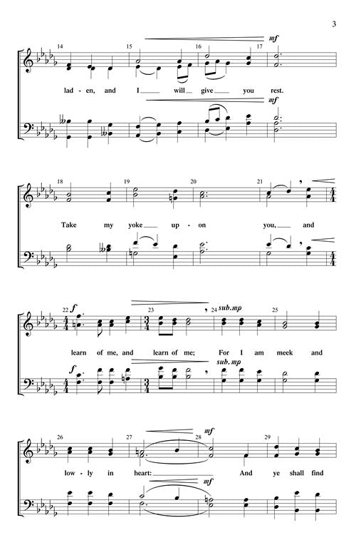 This worshipful a cappella setting of a familiar text beckons us to grasp the truth of Chrit's call to come to Him and find rest. Prayerfully penned with rich choral writing, this reverent reminder truly depicts the love that God holds for His saints. Easy to medium.