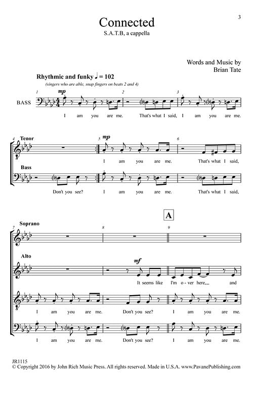 Brian Tate wants to help bring us all together and uses his imaginative music and community-building texts to make it happen. Each vocal part gets its own statement and they sequence together into a rollicking chorus, all a cappella, all fun. High school, community, even college choirs can find a joyful spot to program this number. Easy.