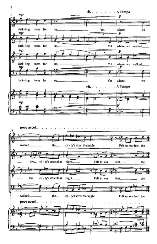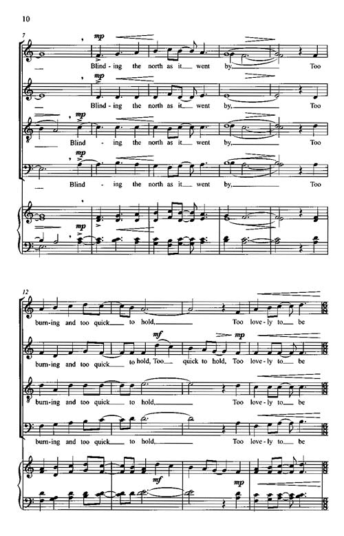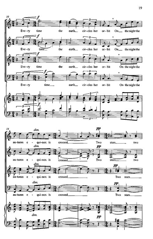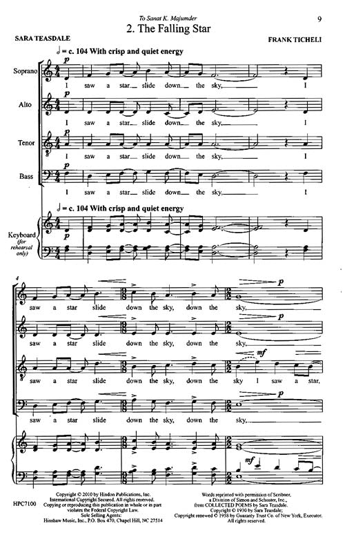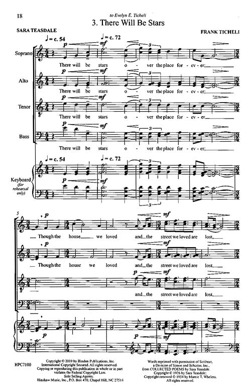 The brief three movements of this work are set to poems of Sara Teasdale and can be performed separately or together. The composer has set the piece for unaccompanied mixed chorus divisi, and says that the cycle utilizes the image of stars as a powerful symbol of eternal beauty and peace. Difficulty Level: Medium Advanced Adult.