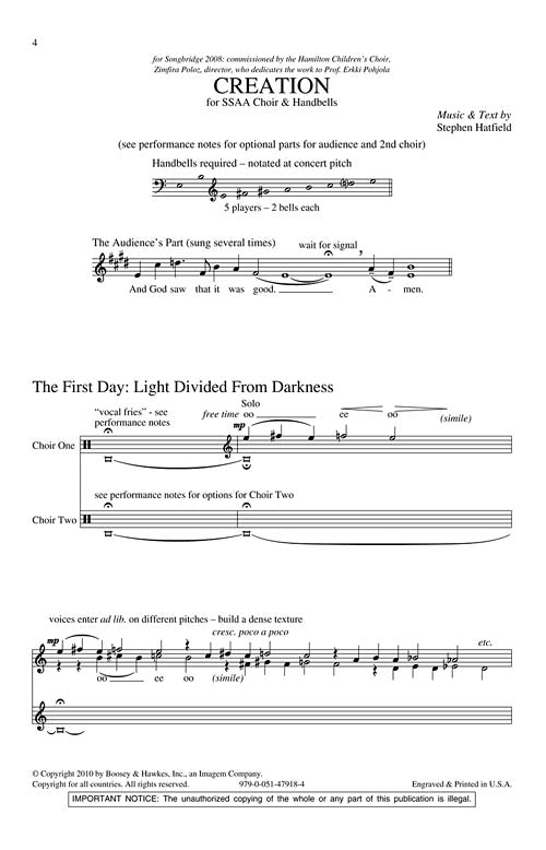 Creation is in seven short movements that parallel the seven days described in the Bible. At the end of each day there is a short hymn of thanksgiving based on the text And God saw that it was good. Written for treble chorus and handbells, there are opportunities to make creative decisions about soundscapes in free time, as well as the inclusion of the audience and a second choir. Duration: ca. 12:00.