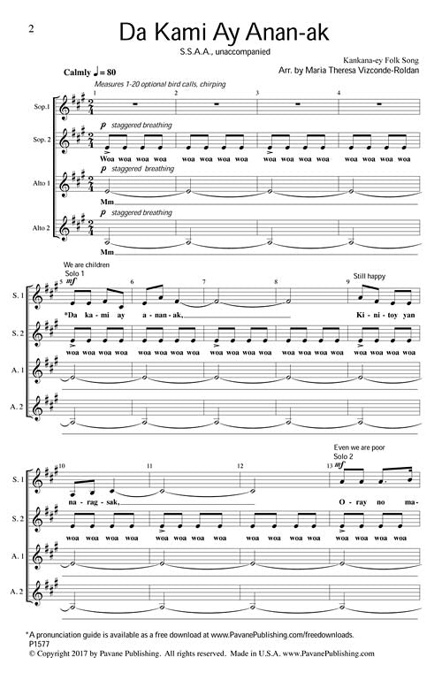 Here is a song that celebrates the joy of childhood - the playfulness, the newness, shrills and laughter. Based on Kankana-ey, a Filipino folk song, the words are also in Filipino as well as non-sensical sounds. The piece begins slowly but quickly accelerates, finally ending in joyful sounds of children's laughter. Medium difficulty, for SSAA children's choirs.