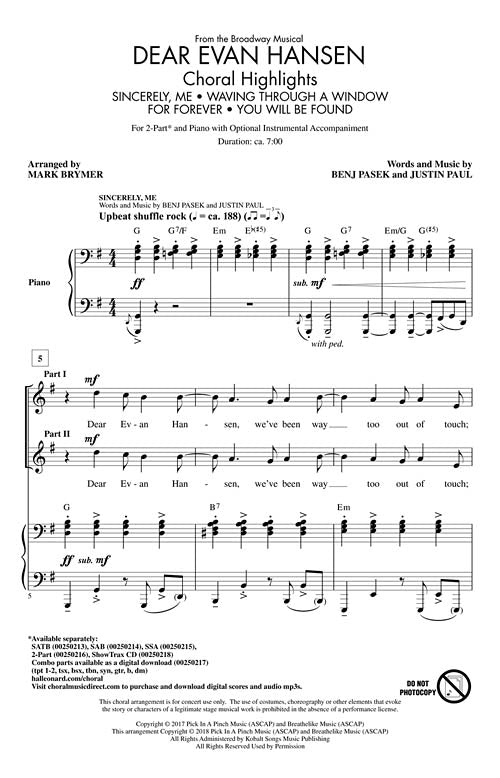 Winner of eight Tony Awards including Best Musical, nominated for a 2018 Grammy award and called one of the most remarkable shows in musical theater history by the Washington Post, here are four of the most powerful songs in one powerful medley. Including: Sincerely, Me; Waving Through a Window; For Forever; and You Will Be Found these songs are skillfully combined to capture the heartbeat of this important show--the need to fit in and be heard.