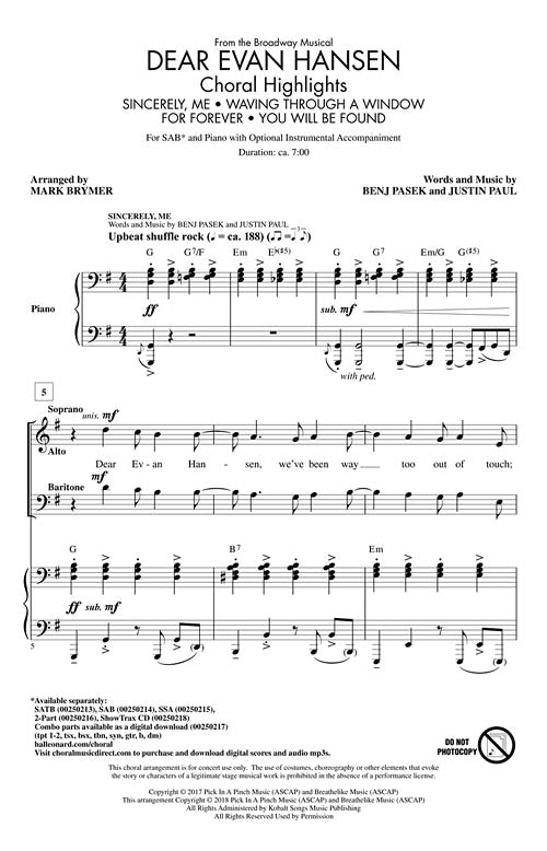 Winner of eight Tony Awards including Best Musical, nominated for a 2018 Grammy award and called one of the most remarkable shows in musical theater history by the Washington Post, here are four of the most powerful songs in one powerful medley. Including: Sincerely, Me; Waving Through a Window; For Forever; and You Will Be Found these songs are skillfully combined to capture the heartbeat of this important show--the need to fit in and be heard.
