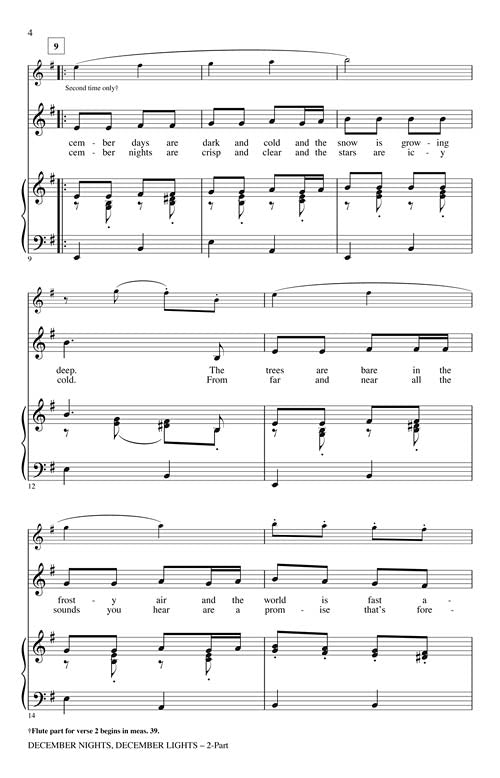 Share the sights and sounds of December with this cheerful holiday original that will warm every heart! Easily learned for younger choirs in elementary and middle school. With flute. Available separately: 3-Part Mixed, Unison/opt. 2-Part, VoiceTrax CD. Duration: ca. 2:30.
