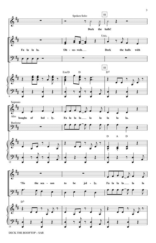 Don we now our Glee apparel and deck the halls with a fa la la and a ho-ho-ho! This hip and dance-y mash-up of Deck the Halls and Up on the Roof Top from The Glee Cast's Christmas Album will be the hit of your holiday show and fun for choirs of all levels! Available separately: SATB, SAB, SSA, 2-Part, ShowTrax CD. Rhythm parts (syn, gtr, b, dm) available as a digital download. Duration: ca. 2:35.