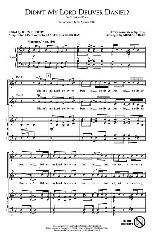Adapted from Moses Hogan's original a cappella setting, this accompanied spiritual has been adapted for 2-part treble voices and includes all the dynamic nuance and the harmonic and rhythmic stylings of the original SATB arrangement. Performance Time: Approx. 2:00