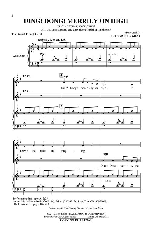 This bright holiday favorite has been arranged with a rhythmic and fun contemporary piano accompaniment supporting the traditional melody and harmonies. Added sections of ding dong dot the arrangement and the optional glockenspiel or handbell parts allow this choral to shine for the holidays. Available: 3-Part Mixed; 2-Part; PianoTrax CD.