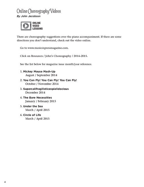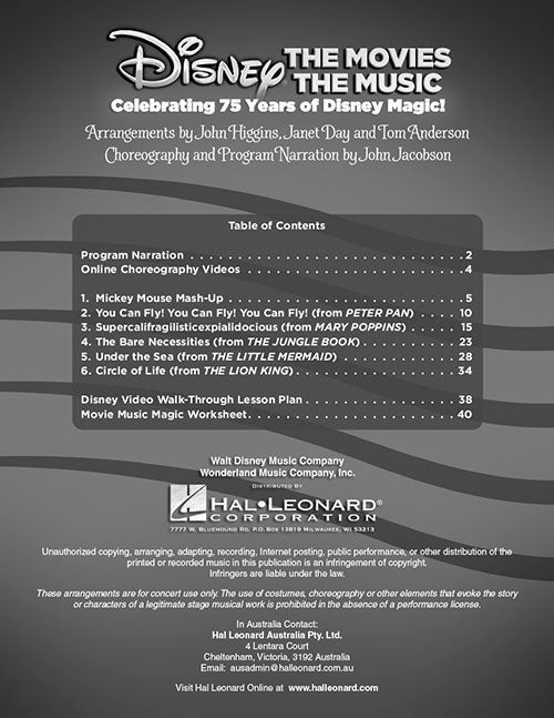 Ladies and Gentlemen! Boys and Girls! Children of all ages! Welcome to the wonderful world of Disney! Celebrate 75 years of Disney magic and some of the music that helped make that magic happen with favorite songs from the movies of Peter Pan, Mary Poppins, The Jungle Book, The Little Mermaid, and The Lion King. The Teacher Edition features reproducible program narration, piano/vocal arrangements and choreography. The Singer Edition 20-pak features singer parts in attractive full color spreads with many of your favorite Disney characters. Recordings are provided online for download or streaming. For cost-saving value, the Performance Kit/Audio includes the Teacher Edition, Singer 20-Pak and performance/accompaniment audio recordings via digital download. About 25 minutes. Suggested for grades 2-5.