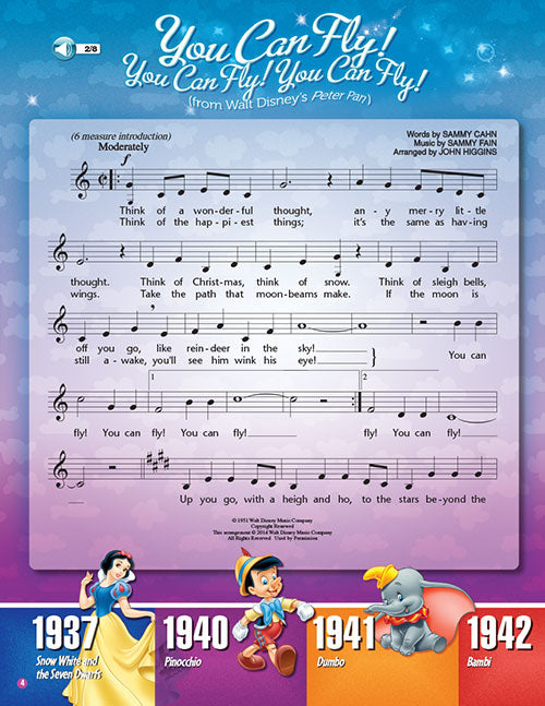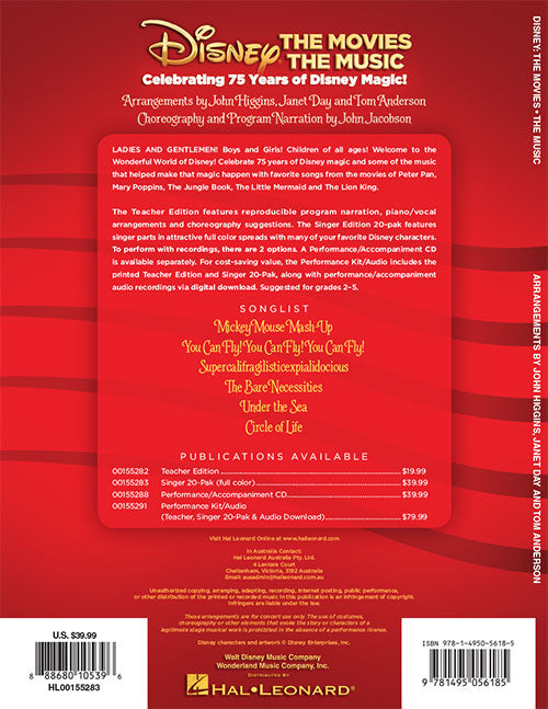 Ladies and Gentlemen! Boys and Girls! Children of all ages! Welcome to the Wonderful World of Disney! Celebrate 75 years of Disney magic and some of the music that helped make that magic happen with favorite songs from the movies of Peter Pan, Mary Poppins, The Jungle Book, The Little Mermaid and The Lion King. The Teacher Edition features reproducible program narration, piano/vocal arrangements and choreography. The Singer Edition 20-pak features singer parts in attractive full color spreads with many of your favorite Disney characters. To perform with recordings, there are 2 options. A Performance/Accompaniment CD is available separately. For cost-saving value, the Performance Kit/Audio includes the Teacher Edition, Singer 20-Pak and performance/accompaniment audio recordings via digital download. About 25 minutes. Suggested for grades 2-5.