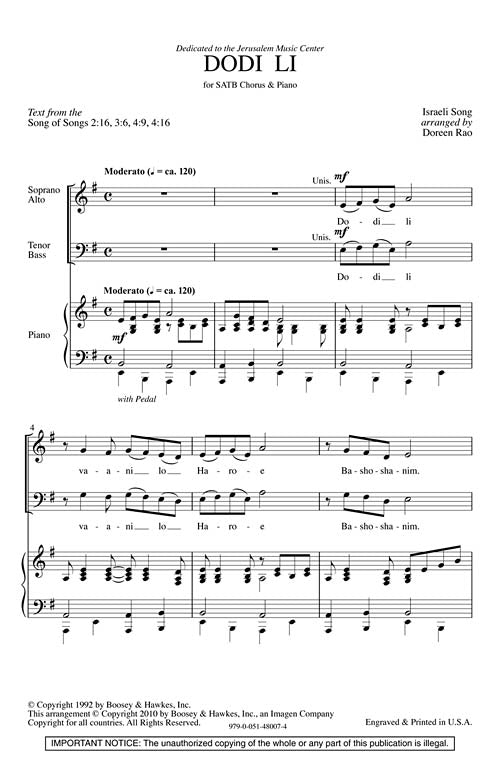 Now available in several voicings and sung completely in Hebrew, this delightful Israeli song, with its text based on a song from the Old Testament Song of Solomon, is an excellent multicultural experience for choirs. Both a pronunciation guide and translation are included in this selection that continues to be popular in festivals and adjudications nationwide. Duration: ca. 2:00.