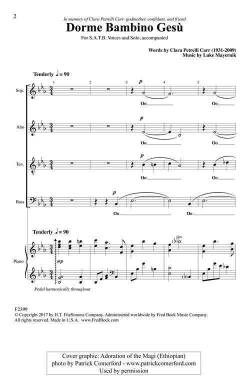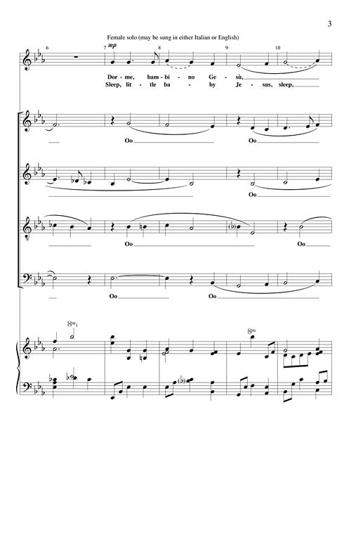 This is the perfect piece for the Christmas Eve service, a lullaby, tender and sweet. A gentle piano accompaniment supports the choir's oo's as a female soloist presents the verse, sung in either Italian or English. The choir then sings an elegant refrain in Italian, followed by a male solo, leading to the choir's final cadence. A sacred piece for church that could also be used in many secular situations. Easy to medium in difficulty.