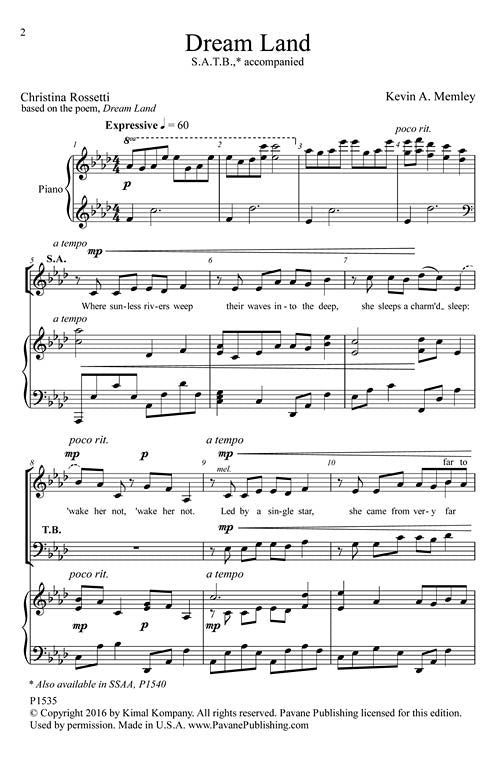 Now available in a Special Edition (raised one whole step for younger choirs and available digitally only), Kevin Memley displays, again, his command for expressing poetry in song. The musical lines take us into Christina Rossetti's poem, into her dream, and speaks for all of us at the same time. High school, community and college choirs will embrace the artistry in this concert selection. Medium.
