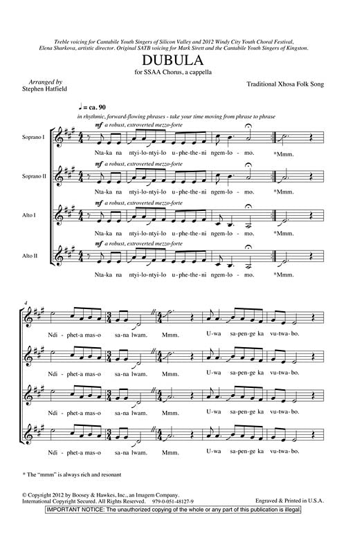 Now available for SSAA voices, this South African folk song of the Xhosa people is boisterous, open-throated and joyful. Duration: 3:30.