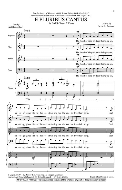 This David Brunner work evolved from a project that involved middle, high school and college singers in a virtual choir environment. The text, with its strong rhythm and sturdy refrain, artfully captures what it feels like to be a singer in a chorus. The entire work is an anthem to bands of empowered singers everywhere: from many, comes one song! Duration: ca. 2:25.