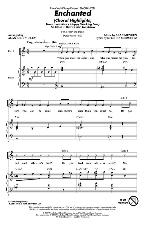 With songs by Alan Menken (The Little Mermaid) and Stephen Schwartz (Wicked), this Disney hit movie is joyful, funny and charming and this 6-minute medley is perfect for choirs and singers everywhere! With Happy Working Song, it even includes a spoof of the classic Disney films of the past! Songs include: Happy Working Song, So Close, That's How You Know, True Love's Kiss. Available separately: SATB, SAB, 2-Part, ShowTrax CD.