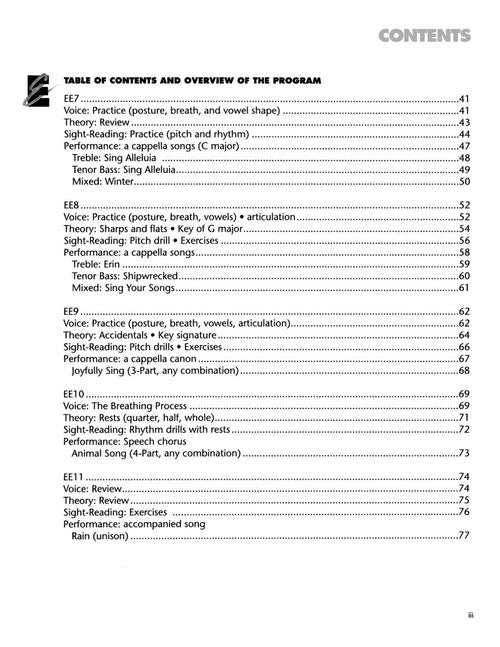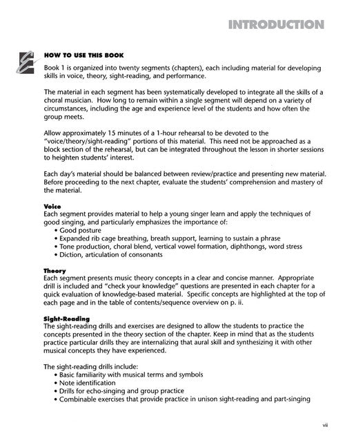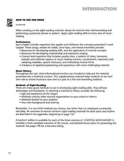 Essential Musicianship, Book 1, recommended for Grades 6-8 or other beginning groups, is a sequential choral method that helps the beginning singer develop a strong foundation of musical skills. In each of the twenty chapters a concept is presented in the theory section, practiced in the sight-reading section, and applied in the performance of a song. Book 1 contains drills, exercises and 37 practice/performance songs for mixed, treble and tenor bass choir.