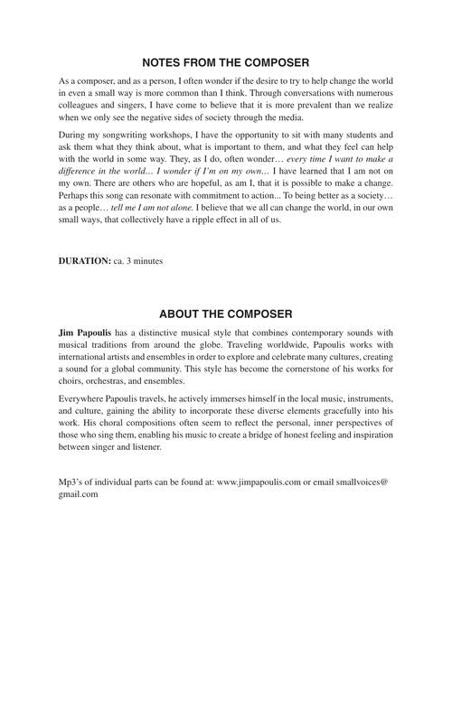 I can see that beauty lives deep inside of me is a message all young people are discovering. They can make a difference in the world if they believe this important sentiment. As always, Jim's music is full of rhythm and energy. This song of hope and possibilities will inspire your singers and your audience.