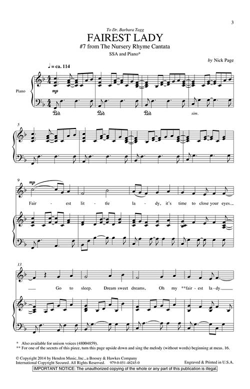 Originally written for unison choir with descant and part of Nick's Nursery Rhyme Cantata this new voicing for SSA and piano is lush and worthy of any fine choir. Dedicated to Dr. Barbara Tagg and already performed by one of her choirs at Syracuse, her stamp of approval for this arrangement is high praise indeed. Duration Ca. 3 minutes
