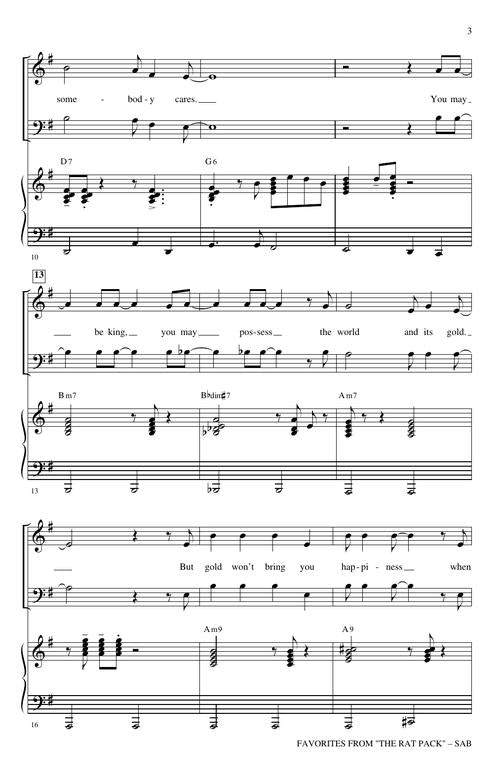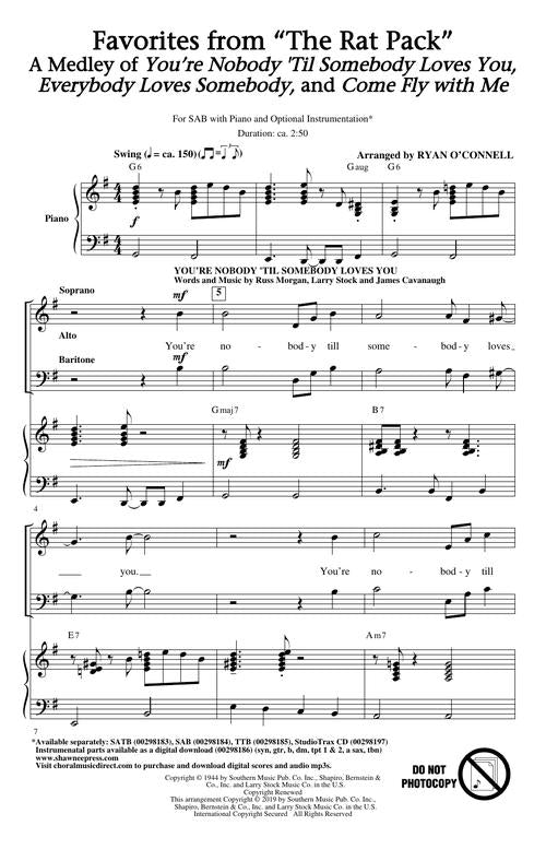 Frank Sinatra, Dean Martin and Sammy Davis Jr. were one of many in the Las Vegas casino scene and made the rat pack name famous and beloved. Here is a medley of some of their hits they did individually and as a group in concerts, stage, television and film. The medley, fantastic for mixed as well as men's choirs, includes You're Nobody Till Somebody Loves You, Everybody Loves Somebody Sometime, and Come Fly with Me.