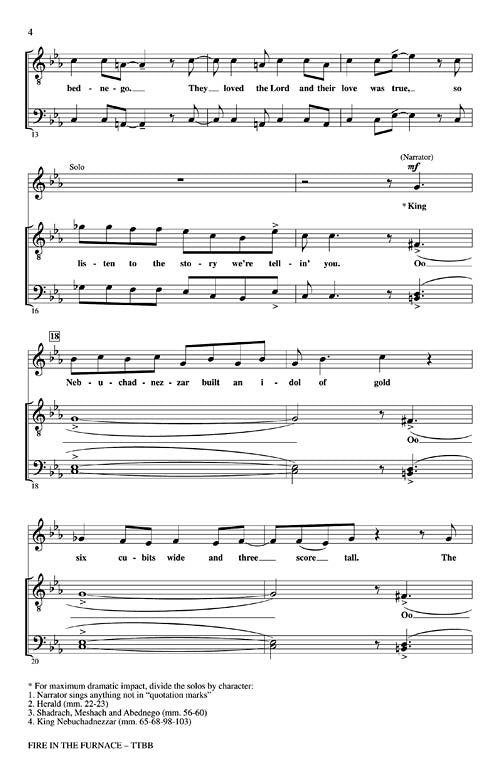 This powerful original spiritual recounts the tale of Shadrach, Meshach and Abegnego as they escape the mighty fiery furnace of King Nebuchadnezzar. A super showcase for men's groups! Performance Time: Approx. 3:40