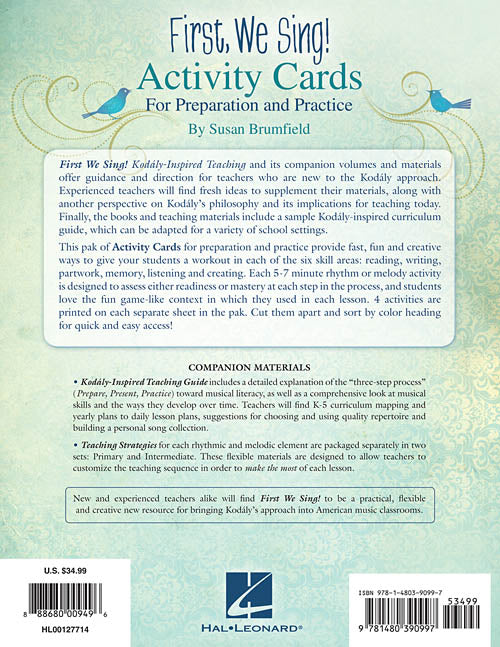 The First We Sing! Activity Cards provide fast, fun and creative ways to give your students a workout in each of the six skill areas: reading, writing, partwork, memory, listening and creating. Each 5-7 minute rhythm or melody activity is designed to assess either readiness or mastery at each step in the process, and students love the fun game-like context in which they used in each lesson. Four activities are printed on each sheet in the pak (printed on sturdy card stock) - cut them apart and sort by color heading for quick and easy access! New and experienced teachers alike will find FIRST WE SING to be a practical, flexible and creative resource for bringing Kodaly's approach into American music classrooms.