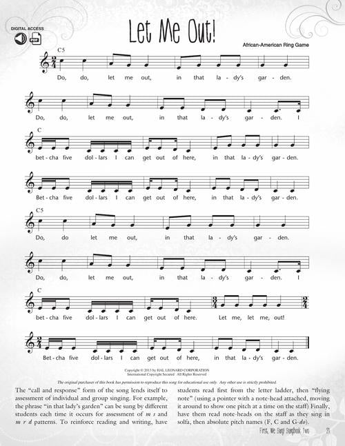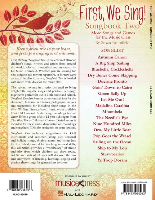 First We Sing! Songbook Two More Songs and Games for the Music Class Softcover Audio Online Book with Audio Online First, We Sing! Songbook Two is a collection of 18 more children's songs, rhymes and games from around the world, selected, transcribed and annotated by Dr. Susan Brumfield. Whether you are looking for new songs to add to your repertoire, or for new ways to teach familiar favorites, Songbook Two is loaded with more fresh ideas for the music class. This second volume in a series designed to bring delightfully singable songs and practical pedagogy together is perfect for use in both home and school. Songbook Two also features extension activities for the classroom, historical references, pedagogical indices and suggestions for including these songs in the First We Sing! literacy-based music series available from Hal Leonard. This second volume comes with DIGITAL ACCESS to demonstration recordings featuring Inner Voices, a group of 8-12 year old singers from The West Texas Children's Chorus, and PDF songsheets for projection or print options. Songbook Two includes suggestions for Orff instruments and recorder, along with seasonal and holiday songs, singing games and songs just for fun. Ideally suited for teaching musical skills, this collection provides a vocabulary of music and play from which children can draw today. Adults and kids of all ages will discover the fun and enjoyment of listening, learning, singing and playing these songs for generations to come! ScorePlay - click to view score with recording. (https://youtu.be/jB31G-dD3Cw) Inventory # : 00145629 UPC: 888680066406 ISBN: 1495020037 Width: 8.5" Length: 11" Height: 0.13" Product Weight: 0.3 lbs. Number of Pages: 44