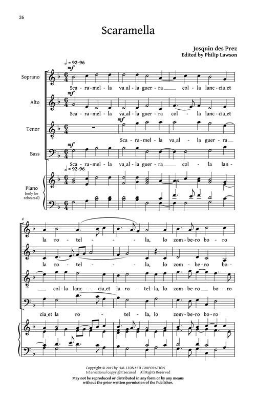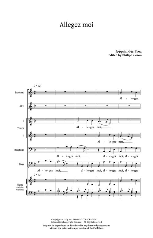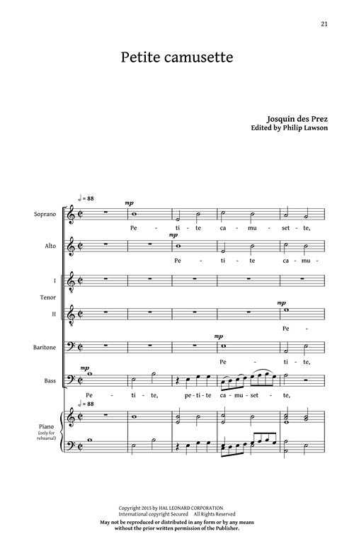 Here are five representative works of Josquin des Prez, probably the most famous European composer of the high Renaissance style of polyphonic vocal music in a value priced collection for mixed choirs and madrigal groups. Includes: Allegez moi, Mille regretz, Nymphes des bois, Petite Camusette, Scaramella.