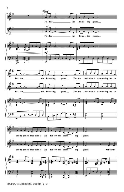 The modal melodies, bluesy piano accompaniment, whispered warnings and layered percussion in this setting of the traditional spiritual create a mysterious atmosphere that dramatically tells the story of the Underground Railroad. Duration: ca. 3:00.