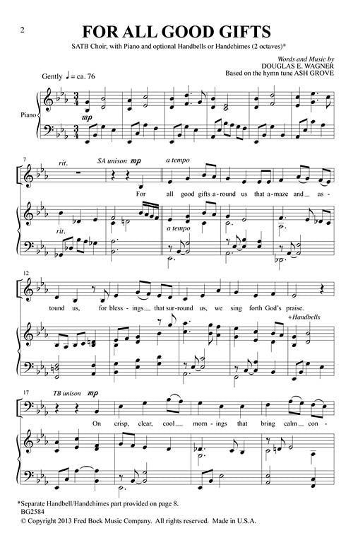 Based on the much-loved Ash Grove tune, Doug's writing is simply superb. His harmonic adjustments are appropriately nourishing, befitting this song of Thanksgiving. Optional 2 octave Handbells or Handchimes dress the piece perfectly.