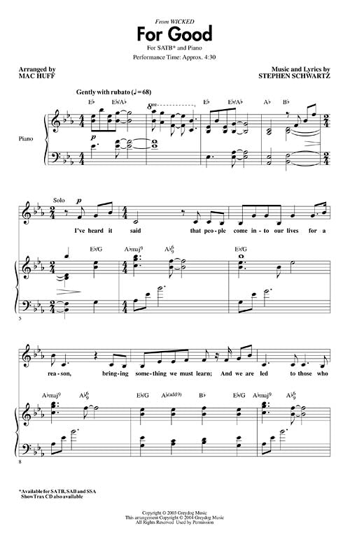 From the Broadway smash hit Wicked, this stirring ballad reminds us of the positive influence we can have on others. ... I have been changed for good.Available separately: SATB, SAB and SSA. ShowTrax CD also available. Performance time: Approx. 4:30.