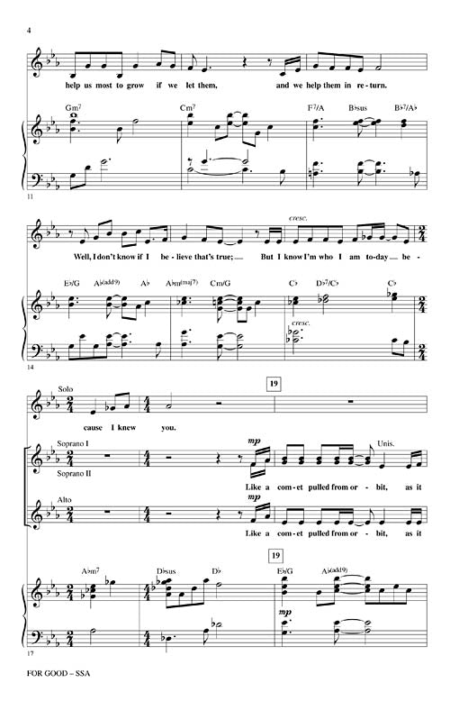 From the Broadway smash hit Wicked, this stirring ballad reminds us of the positive influence we can have on others. ... I have been changed for good.Available separately: SATB, SAB and SSA. ShowTrax CD also available. Performance time: Approx. 4:30.