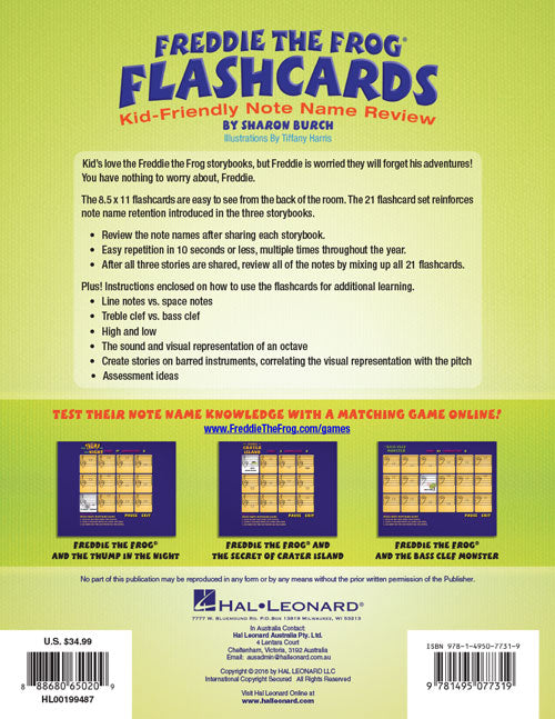 Now available in one set of 21 cards! Reinforce note names introduced in Freddie's first three adventures: The Thump in the Night, The Secret of Crater Island and The Bass Clef Monster. The 8.5 x 11 flashcards are easy to see from the back of the room. Review the note names after sharing each storybook with easy repetition in 10 seconds or less. After all three stories are shared, review the notes by mixing up all 21 flashcards! Plus, instructions are enclosed on how to use the flashcards for additional learning about line and space notes, treble and bass clefs, high and low, sound and visual representation of an octave, creating stories on barred instruments, correlating the visual representation with the pitch, and assessment ideas. In addition, there are matching games online! Suggested for grades 1-3.
