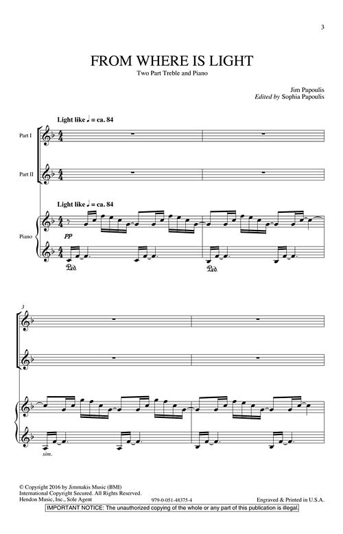 From Where Is Light celebrates the light that lies within each of us. It is a light that can inspire, create, motivate and encourage from the inside out. Performance suggestions utilizing special light effects are included in the performance notes.