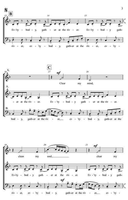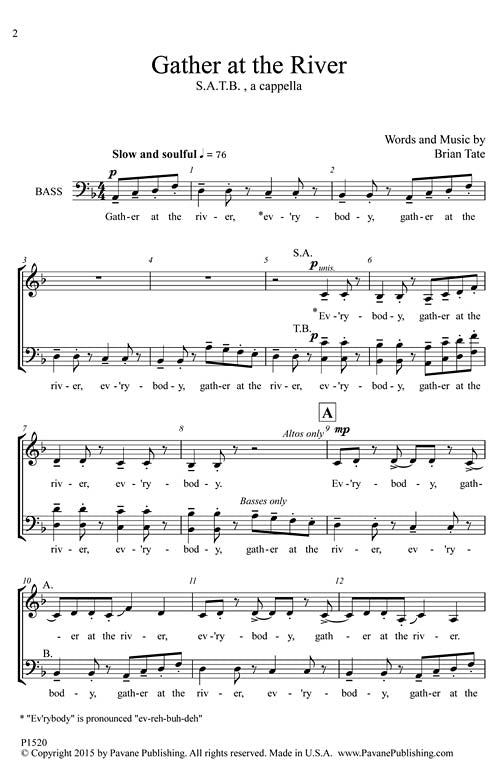 Brian Tate is a master at creating a new song that sounds seasoned in time. Equally amazing is how natural the vocal parts are - almost singing themselves. Gather at the River reminds us of a hymn but sounds like a spiritual, and yet the message remains ubiquitous - both sacred and secular. Middle schools, high schools, churches and community choirs will find this an excellent piece to program. Easy.