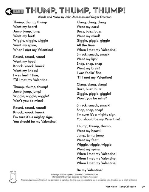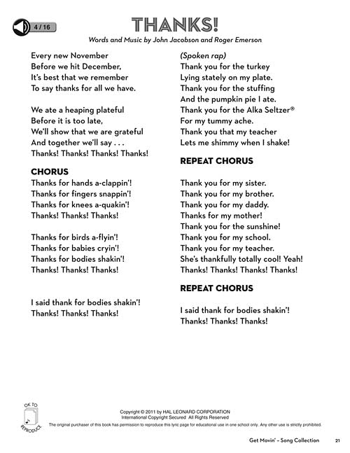 It's time to get movin'! Bring your knees to your nose. Do a little ol' soft shoe. Be a turkey. Make angels in the snow. Be President! Get ready to shimmy & shake and wiggle & giggle from the first day of school to the last. Here are twelve more seasonal songs from the popular Hop 'Til You Drop series that will help you do just that! John Jacobson's Music Express magazine brings you this movin' & groovin' collection! Present each song with helpful teaching tips, simple movement ideas and reproducible lyric sheets. Accompany your class with piano arrangements, or sing-along with John and a group of children singers. Two separate quality recordings are available: a Sing-Along CD and a Performance/Accompaniment CD of song versions with and without singers. Available separately: Song Collection, Sing-Along CD, Performance/Accompaniment CD. Suggested for grades K-3.