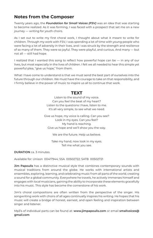 This special 20th anniversary edition has the same notes as the first edition but now, more of the royalties are going to the Foundation for Small Voices. See Jim talk about this special piece on the Hal Leonard Website.