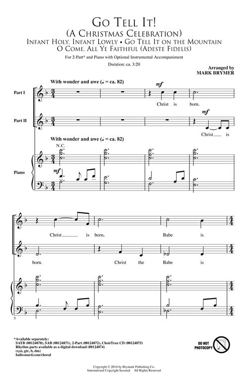 Opening with the tender strains of Infant Holy, Infant Lowly, this contemporary setting then moves into the joyful strains of Go Tell It on the Mountain, over an exciting percussion groove. Weaving in snippets of other familiar carols, this work will energize your Christmas programming and bring a freshness to the season your listeners will enjoy.