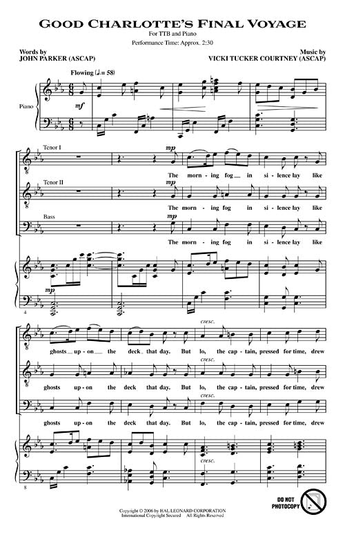 The roar of the sea comes to life in this dramatic original work that tells the fateful story of the ship Good Charlotte. A fantastic choice for developing male choirs! Performance Time: Approx. 2:30.