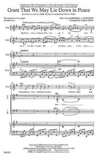 A setting of the Hashkiveinu text, a bedtime prayer with broad implications: Spread over us the shelter of Your peace. A beautiful melody ably supported by simple four-part choir.