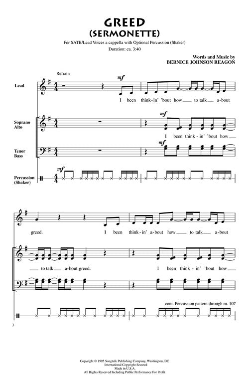 From Bernice Johnson Reagon's sermon in music, we are confronted by the sin of greed in each of us. Recorded by Sweet Honey in the Rock, this song offers a humorous but astute assessment of our culture and institutions.