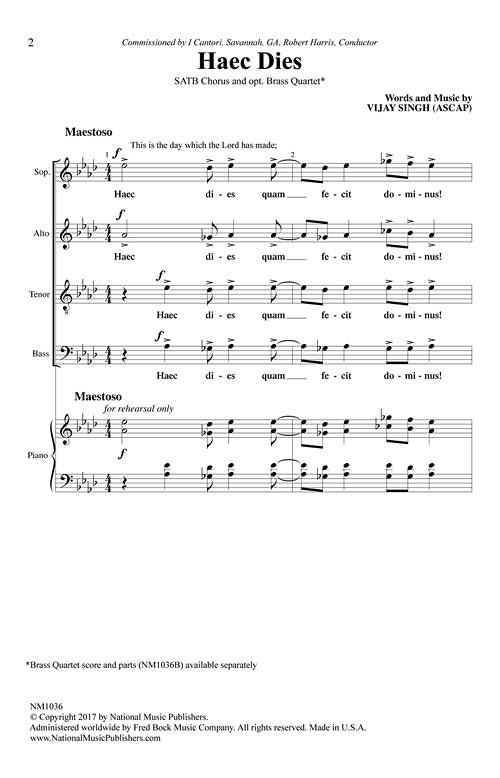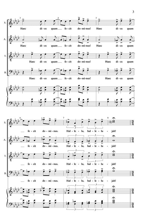 This dynamic choral is a winning festival piece. With a repeating rhythmic motif the drive forward is compelling and easily learned. The familiar Latin text celebrates the day with great rejoicing. High school, college and community groups will want to program this energetic number accompanied by Brass quartet or piano. Easy to Medium.