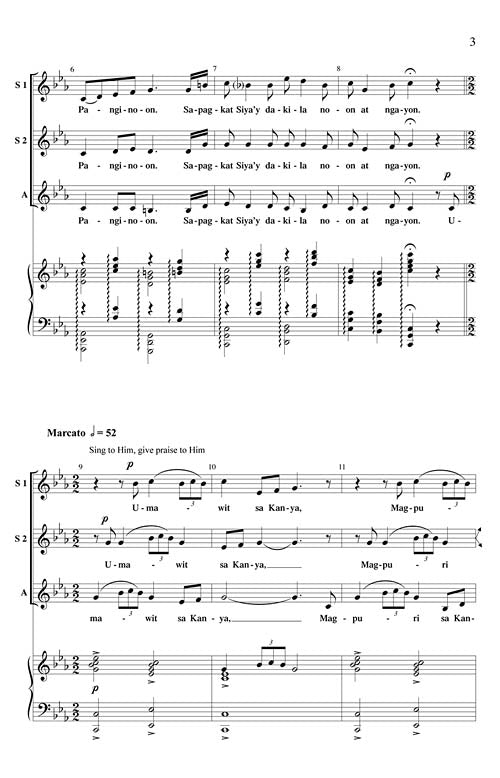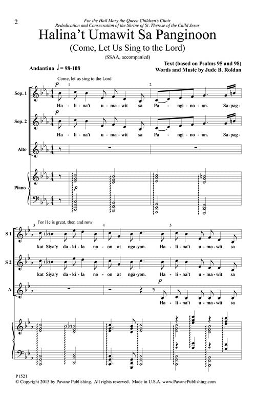 For years Jude Roldan has been composing music for the world-famous children's choir that his wife conducts, Hail Mary the Queen Children's Choir. Although often based on sacred words as is common in the Philippines, this is a concert piece. It begins gently but soon breaks into a dynamic and pulsating hallelujah section that is captivating. Treble choirs of all ages, medium difficulty.
