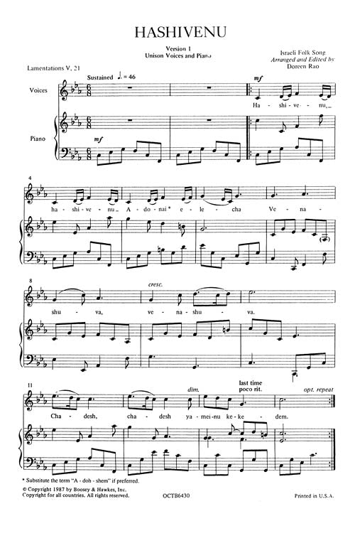 Hashivenu is a melodic and hauntingly beautiful Hebrew song. The sound and meaning of the text is fundamental to the expressiveness of the song. Contains two arrangements: one for unison voices and piano, and one for SSA a cappella in canon form.