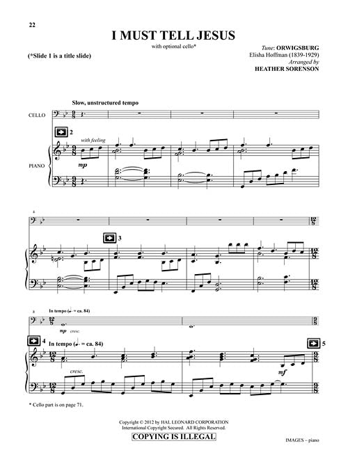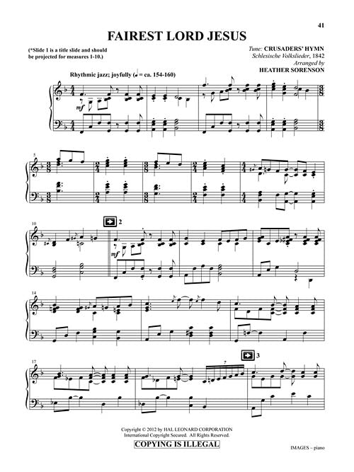 This is a groundbreaking album/book from the multi-talented Heather Sorenson. As the moniker implies, these highly impressionistic arrangements are designed to capture the ear and eye while portraying the spirit of each of the arrangements. When combined with the innovative visual supplement, the church pianist moves their ministry from its traditional role into a new area of expression. The arrangements are filled with variety and are effective with or without the visual component. Optional cello and/or violin obbligatos are included on many of the titles. Includes: Beautiful • I Surrender All • Fairest Lord Jesus • Blest Be the Tie • I Must Tell Jesus • It Is Well • Brethren We Have Met to Worship • Whiter Than Snow • A Mighty Fortress • The Journey (with He Leadeth Me)